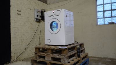 Closed-circuit video installation, built from a deranged washing machine with a little help from a video camera, a Raspberry Pi, and a screen.
